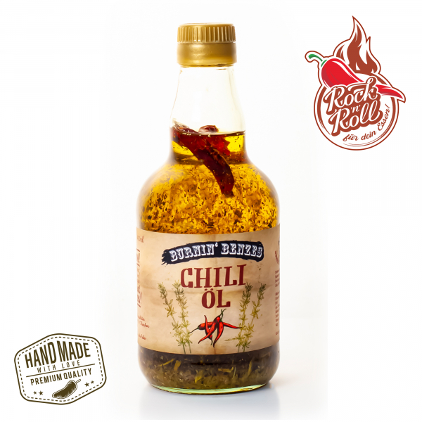 Aus einheimischen Rapsöl des Fichtelgebirges hergestelltes und verfeinertes, mediterranes Chili-Öl a la Burnin’ Benze.