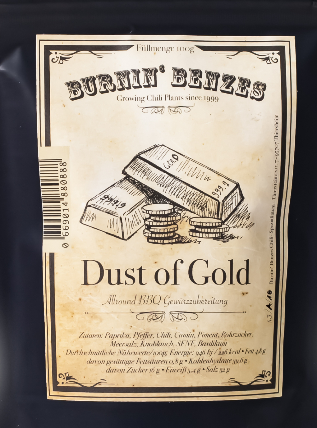Zutaten: Paprika, Pfeffer, Chili, Cumin, Piment, Rohrzucker, Meersalz, Knoblauch, SENF, Basilikum