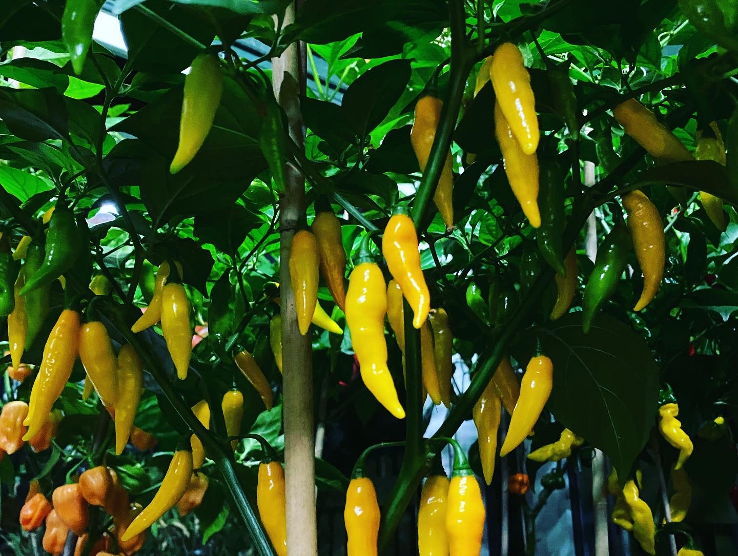 Früchten hängen an den ziemlich klein und kompakt bleibenden Pflanzen. Eine wunderschöne Habanero Variante mit